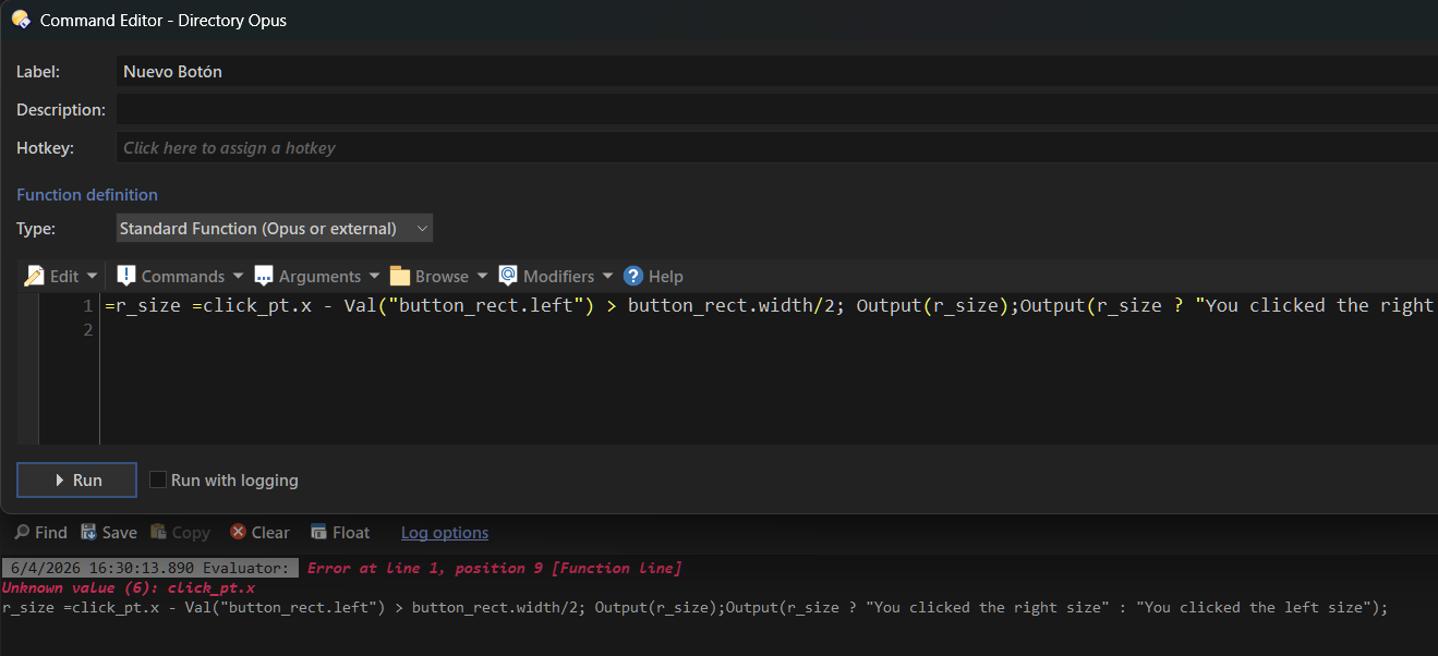 However, it will work if you change it to something like: =c = click_pt; b = button_rect; r_size = click_pt.x - Val("button_rect.left") > button_rect.width/2; Output(r_size); Output(r_size ? "You clicked the right size" : "You clicked the left size");
