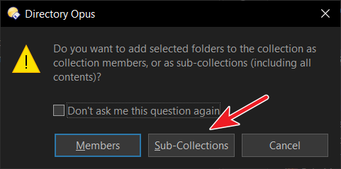 I am asked if I want to add selected folders (I only selected one, but its contents are implied here too I guess) as Members or Sub-Collections. I choose the latter.