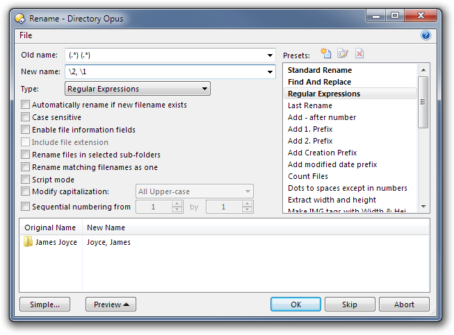Example: 'James Joyce' change to 'Joyce, James'