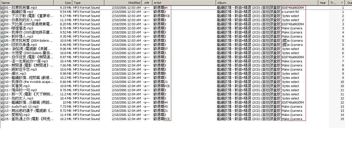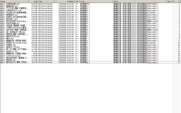 I have a folder of mp3 files which are in Chinese characters. If I only display filename, it's fine. But whenever Context type turned on OR Title & Artist column enabled, DOpus crashes (closes itself automantically). This problem only occurs when there are 2+ files in the folder. If I have one file, DOpus won't crash but Artist and Title won't display properly. For example of display problem - [Filename.mp3 | Modified date: 4/26/2006 5:21PM | Attribute: -a | Artist: Singer 5:21 | Album: Album Title -a]