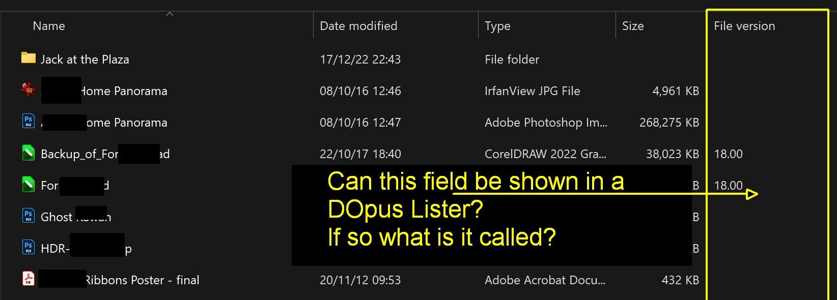 I would like to add a column to some of my DOpus listers to show the version of software which was used to create any given file. It seems that the closest I can get is the currently installed, default software for opening a file ("Type" column/field)