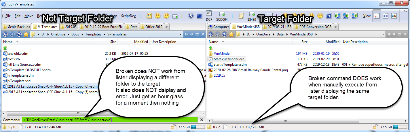 Unless the command is run from the target lister the "Start Vueminder.exe" cannot find the subfolder to run whatever else it needs to run.