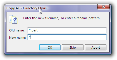 If it's not something you're going to do a lot then you don't need to create a custom button to do it, either. Just right-click the Copy button on the default toolbar and type *.part as the old name and * as the new name: