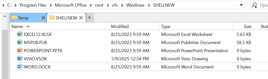 There's even a directory with what I think are the 'template' files for each type and you can see some of them are empty. And if you create a .docx file with right click new, it's 0 bytes as well.