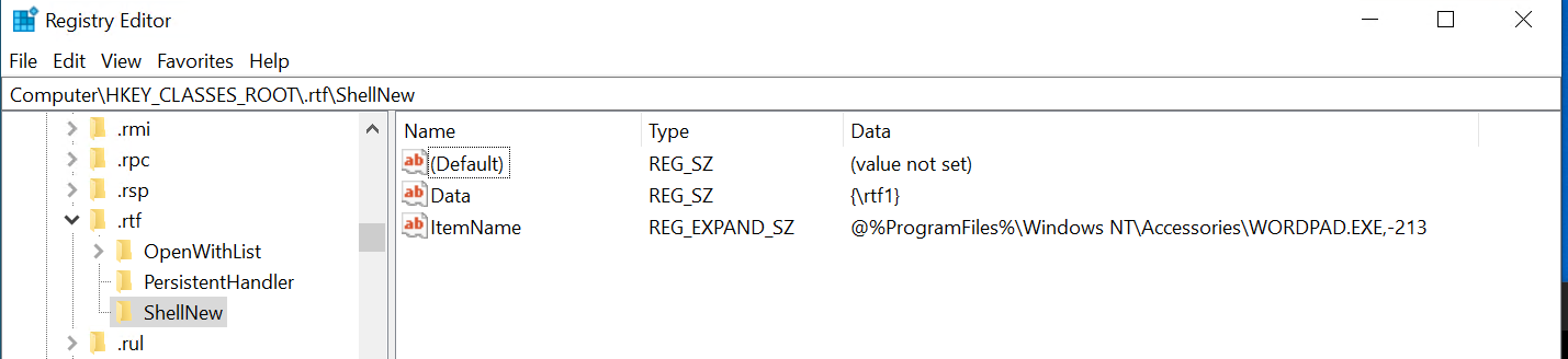 This reg file should put back the RTF filetype into the 'New' file context menu even in regular Windows explorer, and make the usual command work in Opus. It will make it so new Rtf files have the exact same raw contents as the default from Windows 10 (which you can see is just a few characters: {\rtf1}