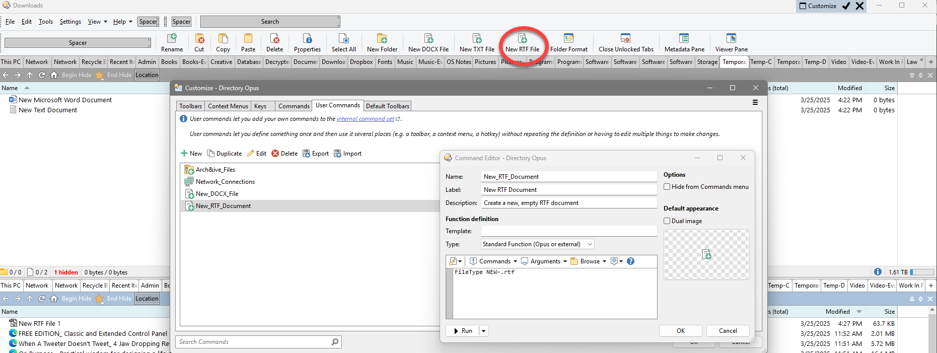 When using Windows 10 64-bit, the custom user command I created: "Create New RTF File" was working fine. N ow with Windows 11 for Workstations 64-bit it no longer functions. When I click on it, nothing at all happens.