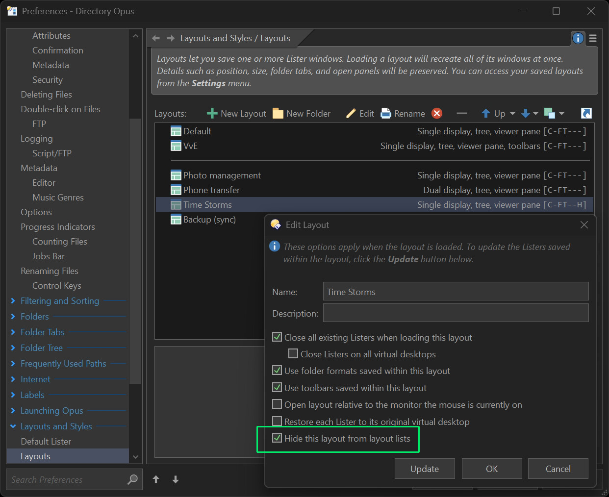 Thank you! From my testing the updated version does hide the hidden Layout ('Time Storms') in the Menu bar > Settings > Lister Layouts > Saved Layouts list.