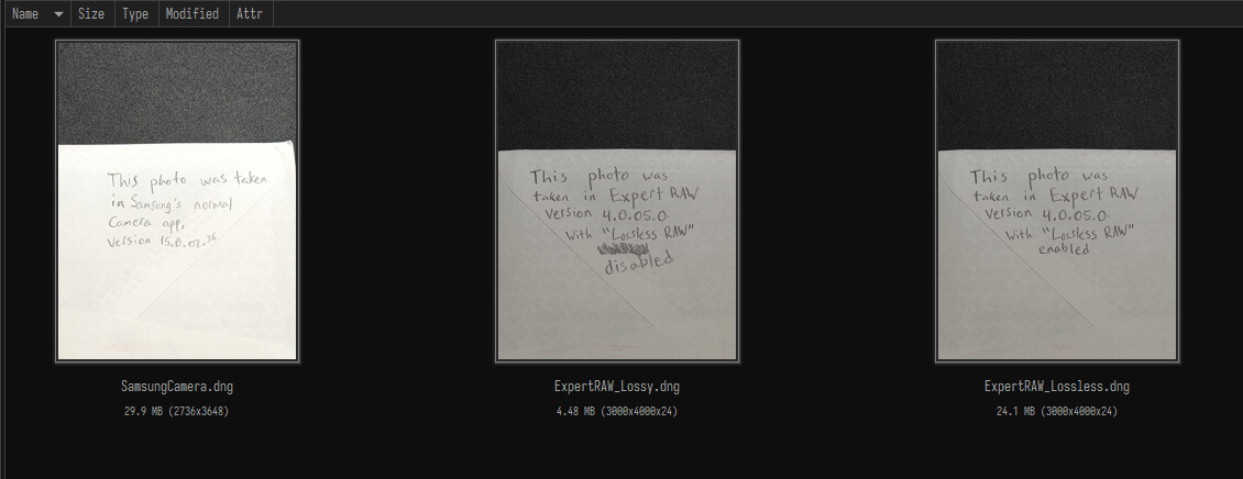 I'm also experiencing this issue. Here's some photos for testing. All taken just now, on a Galaxy S24 Ultra. Two using ExpertRAW 4.0.05.0, freshly installed, and one from the native Samsung Camera app, version 15.0.02.36. The huge idiot responsible for messing up my exposure in the third shot has been sacked.