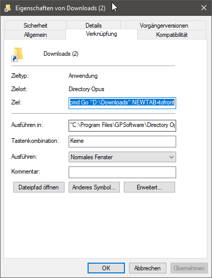 Example: "C:\Program Files\GPSoftware\Directory Opus\dopusrt.exe" /acmd Go "D:\Downloads" NEWTAB=tofront