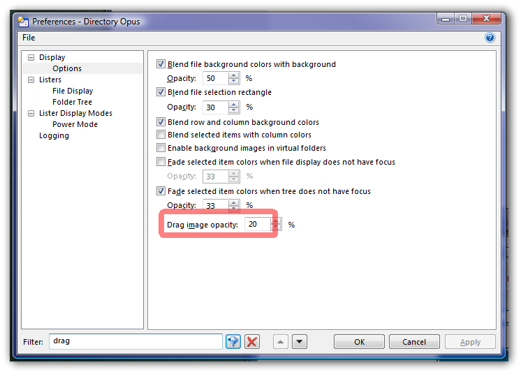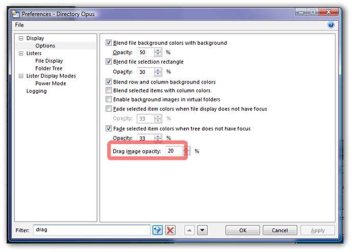 When I drag and drop multiple files from a lister to f.ex. the folder tree, the "box" of the selected files is not transparent enough so it covers the folder tree and makes it very difficult to see where I'm supposed to drop the files. Is there a way to adjust this transparency?