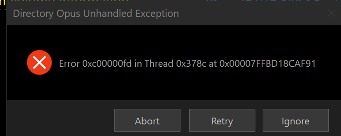 In any case, the shell extension you are using is crashing in both Opus and File Explorer, and needs to be fixed by its authors. Exactly how it crashes in each program isn't very important.