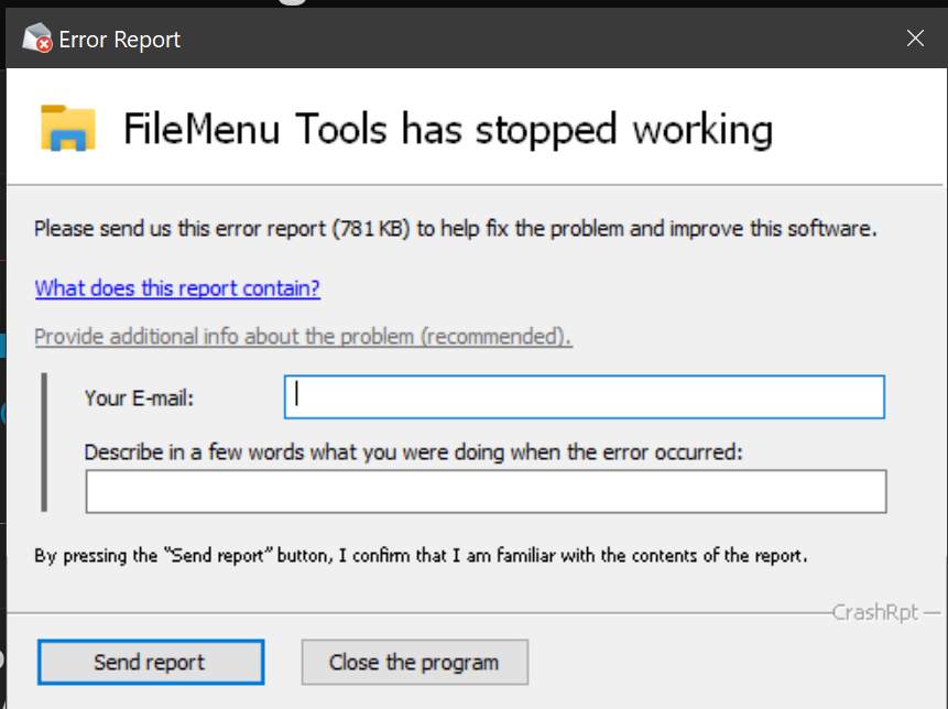 Same problem in Explorer but different option. In Explorer I was presented with the dialog below that bundled up some files and sent it to the developer.