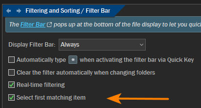 When using expanded folders, and the filter bar is set to select first matching item it doesn’t work. It just keeps the root folder selected, not the matching file.