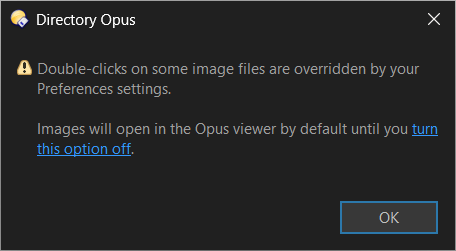 If Open With is used to change the default handler for an image file, and the option to override double-clicks on images is turned on in Opus, a notification message is now shown to explain that double-clicks may be overridden.