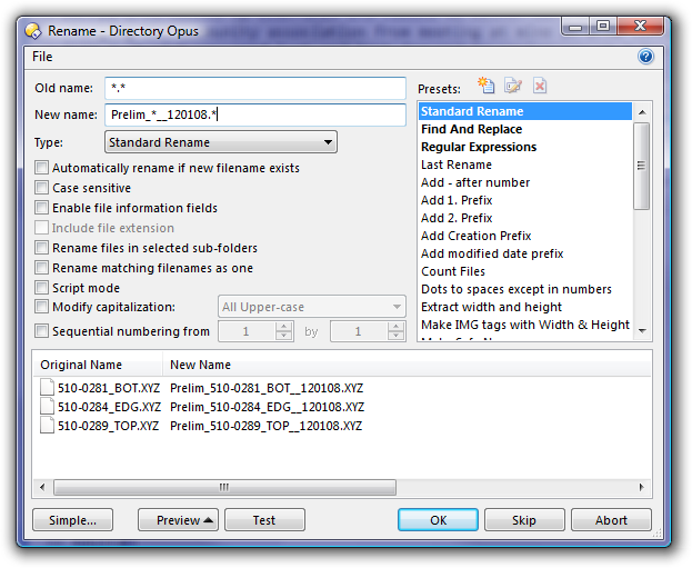 [quote="leo"](Edit: Looks like all three of us answered at once. You've got the choice of a toolbar button using regexps (first answer), a way to use the rename window and regexps, and two different ways to use the rename window and wildcards, including inserting the current date if you want that (this answer).)