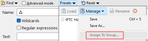 The 'Assign to Group' command in your screenshot is for Find Presets, which aren't the same thing as saved filters.