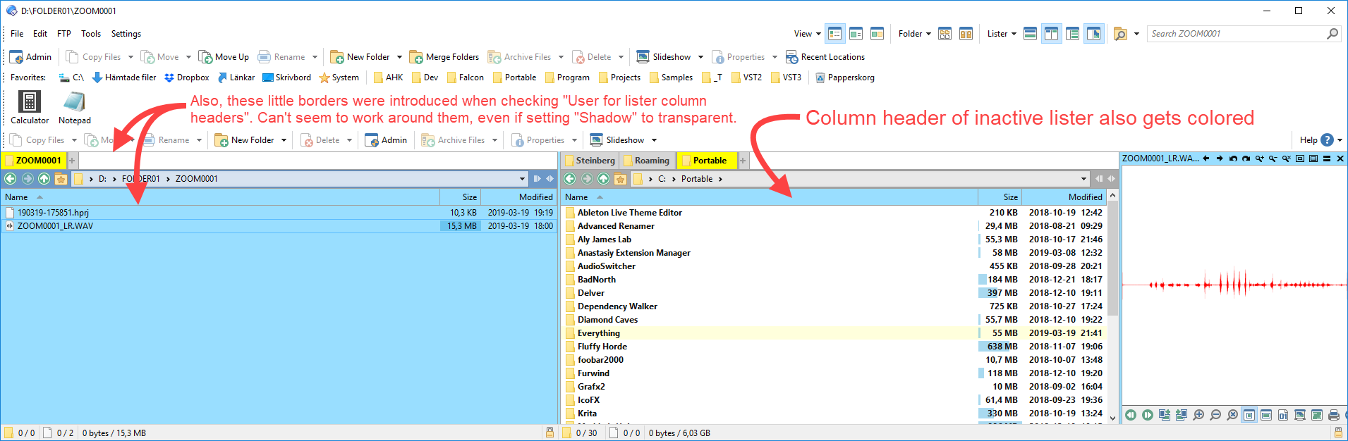 I wish there was a "Pane borders (source)" and "Pane borders (destination)" separation for those theming nerds among us. My goal here is to color the active lister blue, including said column header. Alas, the column header of destination pane gets blue as well ...