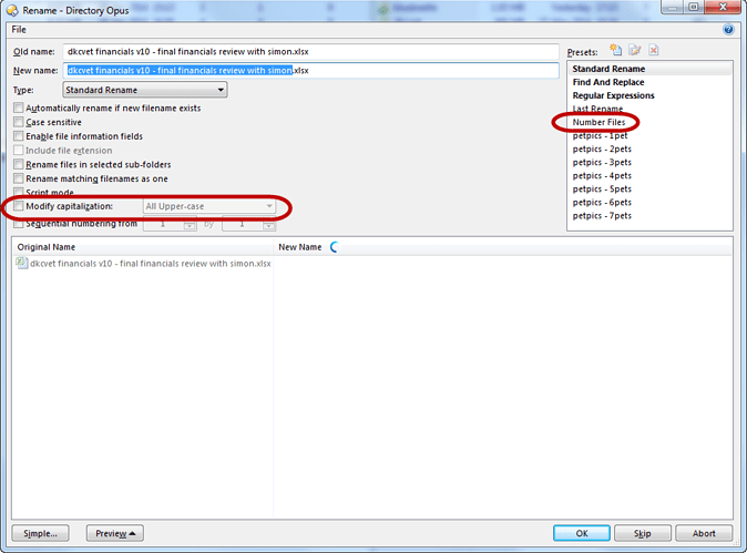 Is there a way to change the default settings for the Advanced Rename dialog box? I usually want to use the "Number Files" option and have "Modify capitalization" set to "Lower-case Extension", but of these are not the default settings when the dialog opens. See attached screenshot.