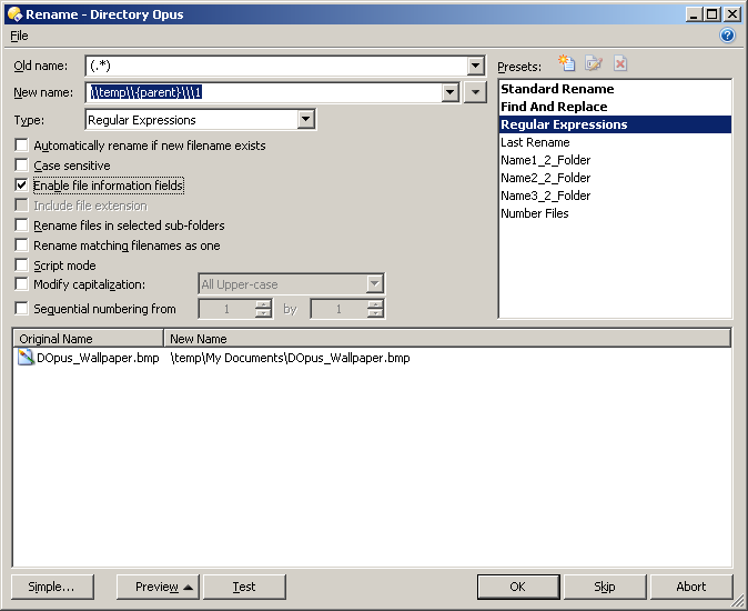 Then setup the Rename window like in my screenshot. (Ignore the list of presets on the right; the important parts are the Old Name, New Name, Type and Enable File Information.)