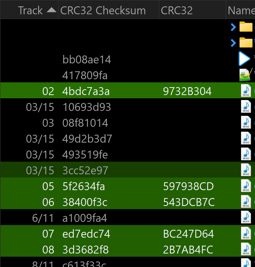 I ensure that the Directory Opus default column "CRC32 Checksum" does not display the CRC value which is created when I ripped the CD with the dbpoweramp program. Now I able to display both of the column and they show diffrent value. the column in the screenshot called CRC32 is shown the value from the dbpoweramp CRC value but the DOpus default column "CRC32 Checksum" shows a new value and I don't know where is from. Thanks to All.