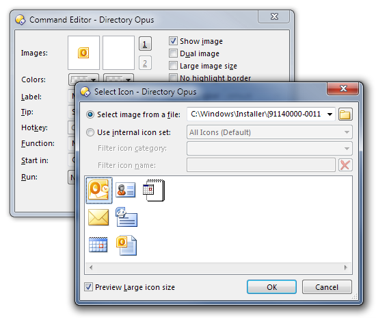 If you edit the toolbar buttons you created you can set the icons explicitly. (They will be inside of excel.exe and outlook.exe)