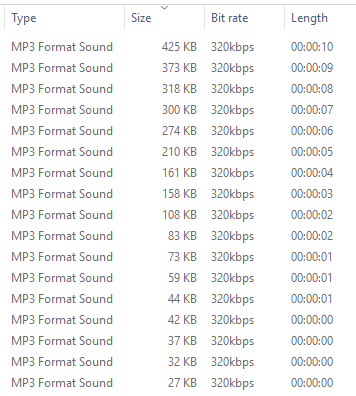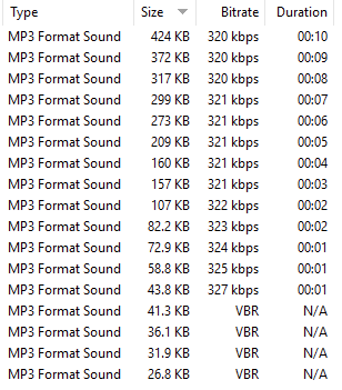When viewing 320kB/s CBR 48kHz mp3 files the bitrate column starts to become inaccurate below about 8s duration until around 1s duration when it just shows "VBR". Other tools like Explorer, exiftool, vlc etc. show the true bitrate.