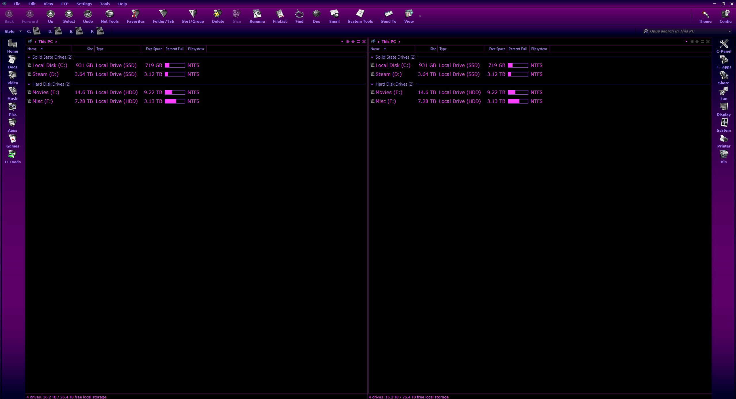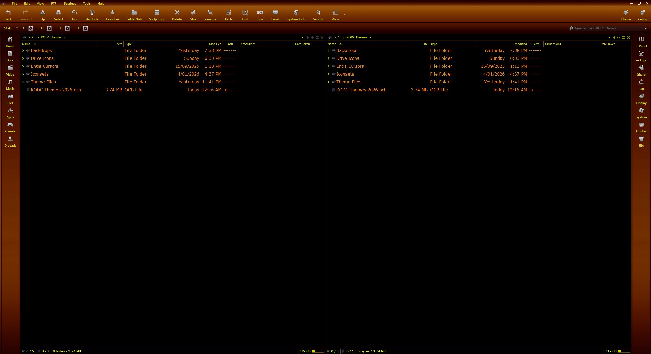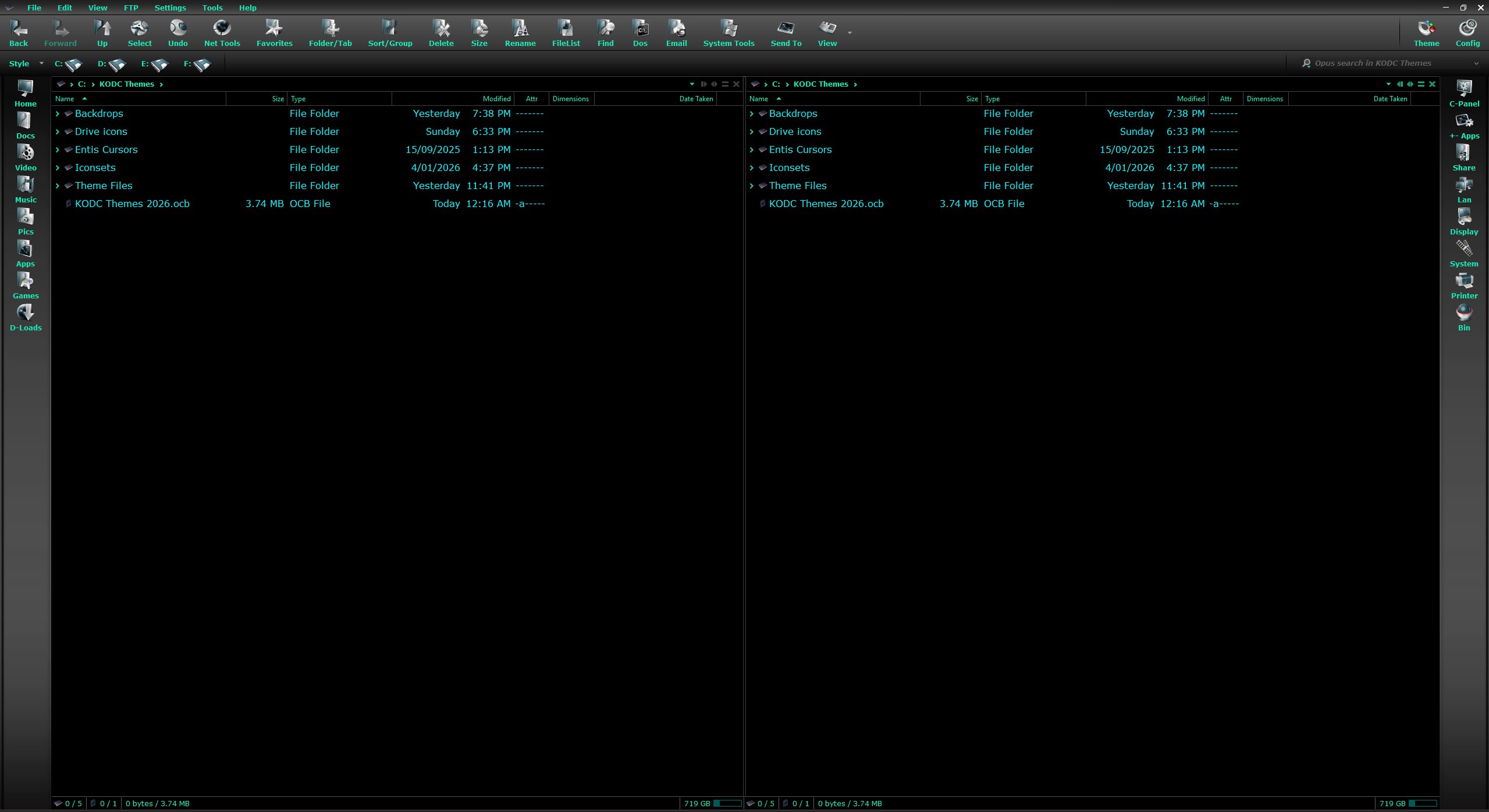 This post links to a Configuration Backups (.ocb files). Unlike themes (.dlt files), configuration backups replace your entire configuration. Installing a configuration backup will change every single Opus setting, and all your toolbars, folder formats, etc., to the ones saved in the file by the author.
