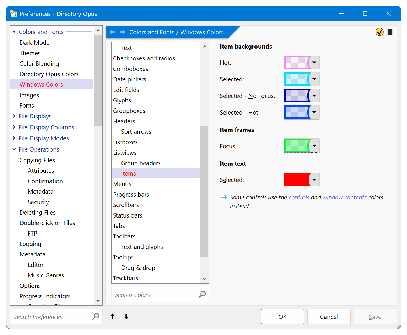 I played a bit around with the colors. The setting for Item text has an effect, but the color for Item frames never gets applied.