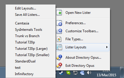 I have always had a Directory Opus icon on the taskbar and have gone to Lister layouts by right clicking the icon and selecting the Lister I wanted to use, since one of the recent updates this functions seems to have disappeared.