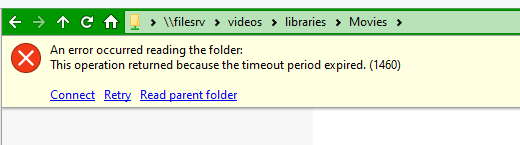 My expectation is that clicking the back arrow after there is a timeout would take me to the previous directory \\filesrv\videos\libraries.