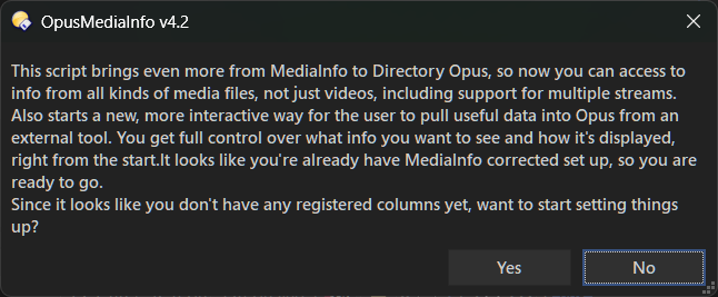 The first time you install the script, it'll ask if you want to start configuring columns, assuming you already have MediaInfo set up correctly. If not, it'll give you some options to continue.