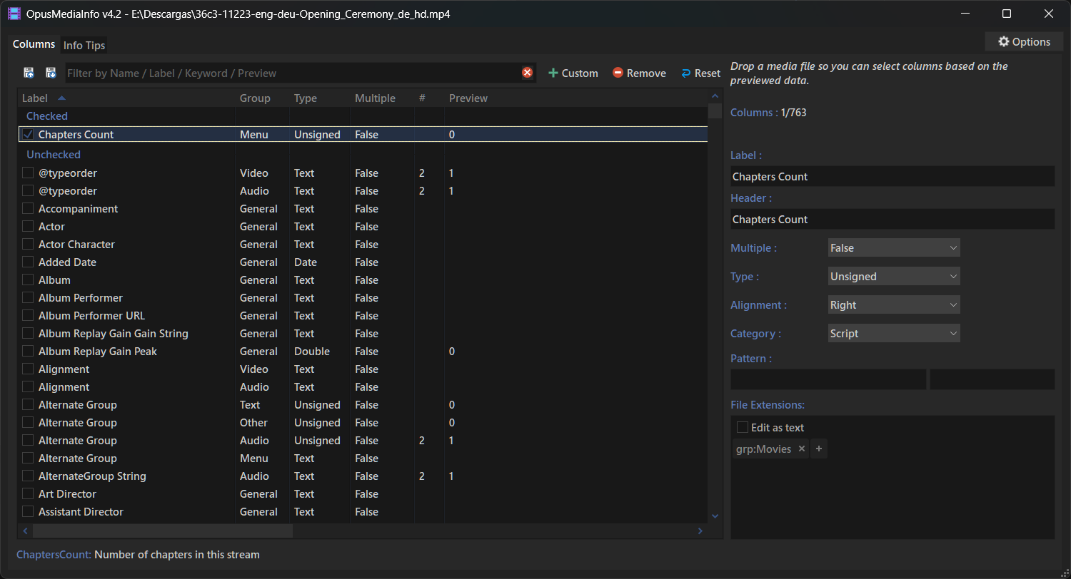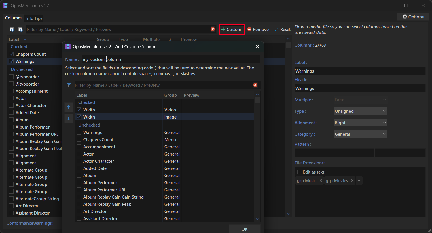 - Now you can create custom columns that access multiple MediaInfo fields to get their value. This way you can have, e.g., a single column that shows the width of the first Video stream if the item is a video, or the width of an image if the item is detected as an image.