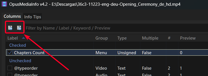 DUMP, which lets you save the MediaInfo report to a file for the requested files, andAS, to choose the format (json, txt, csv, html, and xml). - Fixed an issue that caused tags inside "extra" to not show for sections like Video or Audio.