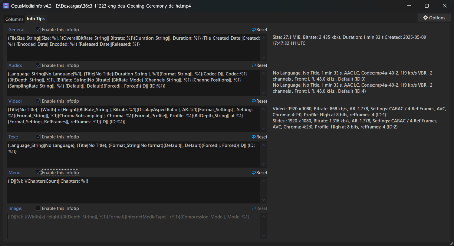 OpusMediaInfo CONFIGcommand. You can also include the fullpath to a file you'd like to preview.