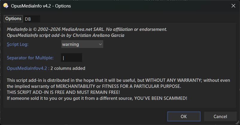 General_ConformanceErrorsandGeneral_ConformanceWarnings. This data can be very useful for finding damaged multimedia files or files that have some kind of issue. - You can access to the Options dialog by clicking the About button from the Script Management window.