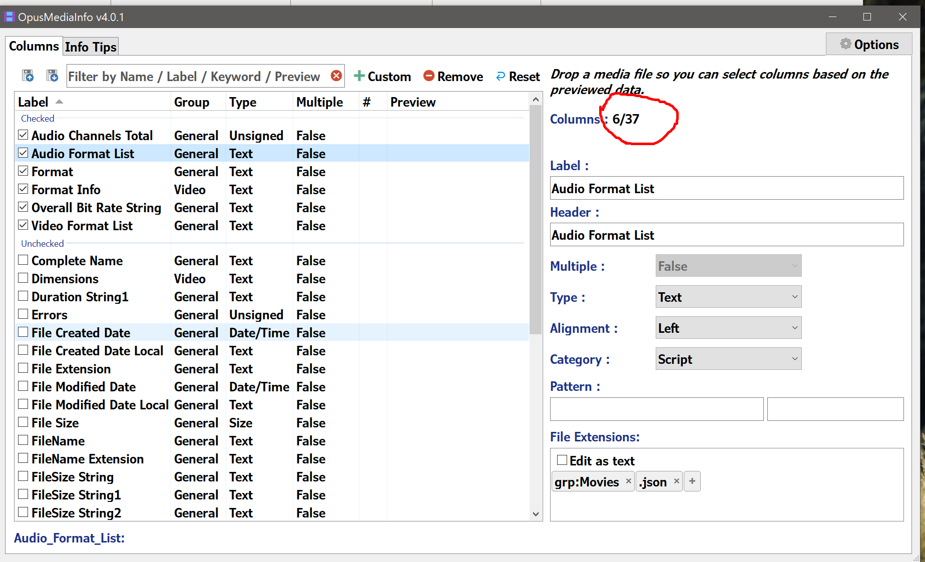 The "seen fields" (aka columns) vary depending on the files you have previewed. Every time you preview a file, all the fields found by Mediainfo in that file are remembered for later use.