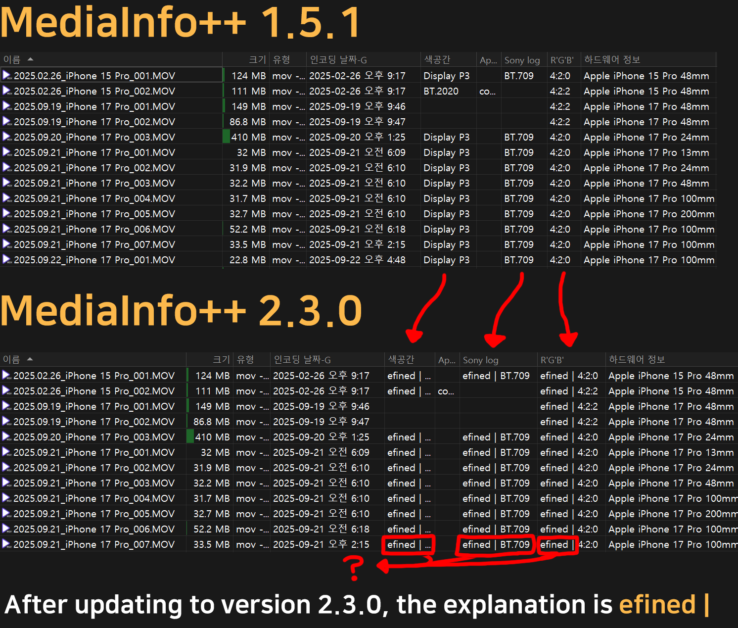 Hi! I was managing the video well through your MediaInfo++ script! So I was happy, but when I updated it to v2.3.0 this time, the word "efined |" suddenly appeared like the attached picture, disturbing the information