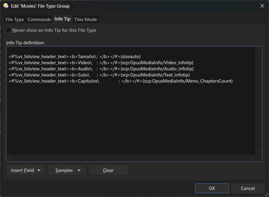 To actually use the infotip in the Opus filetype dialog, you don't need to paste that text, instead simply reference the infotip with its keyword (eg. scp:OpusMediaInfo/General_infotip). Better use the drop-down menu in that same dialog, where all columns are listed.