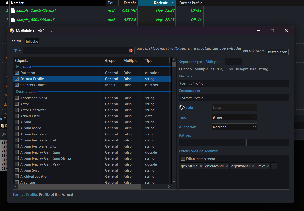 The column logic appears correct - mxf is listed under extensions, and dragging these same files into the MediaInfo++ editor shows full field population. Any insight or diagnostic advice appreciated.