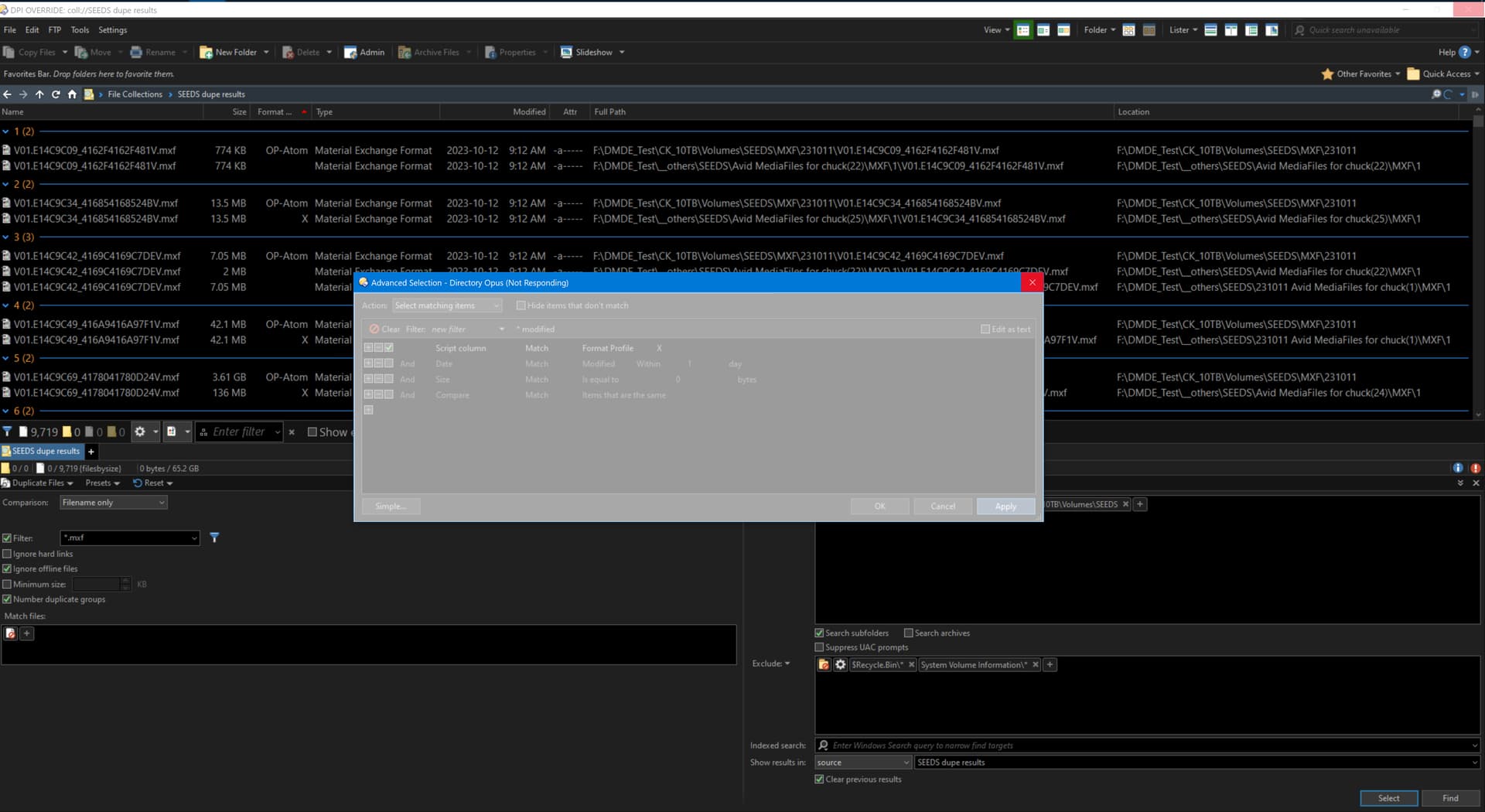I then used Advanced Selection to select rows where the Format Profile column shows "X", but Directory Opus became Not Responding. Is this because it's triggering MediaInfo++ to rescan all files in the result set rather than using the already-scanned "X" values?