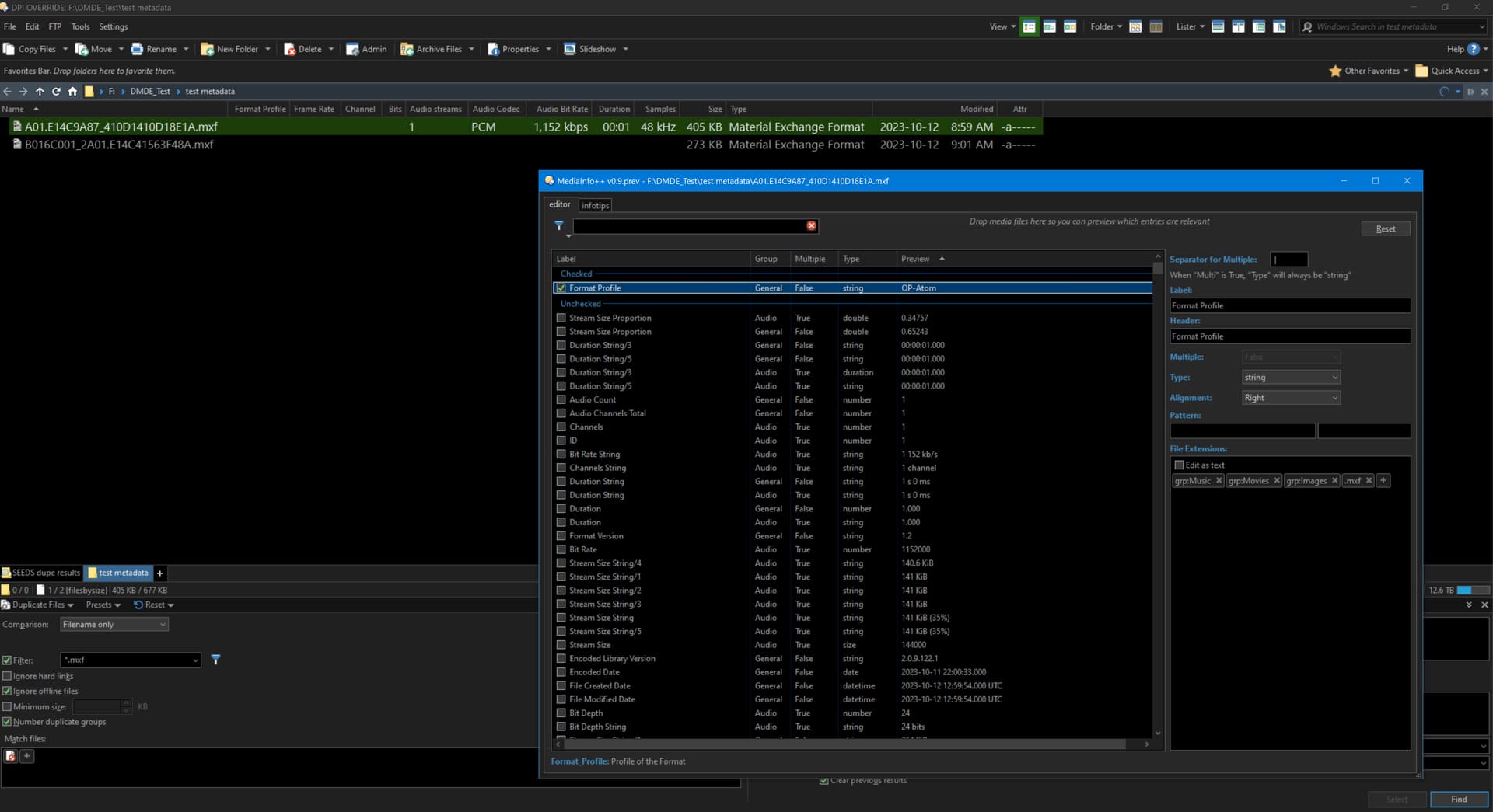 Trying to use this to verify mxf files for a Duplicate File comparison so I can sort by Format Profile and then select the file that is empty (corrupt) in this column but the column has stopped populating. Initially 309 out of 4853 duplicate groups had Format Profile values but upon restarting dopus no files appear to have values in this column.