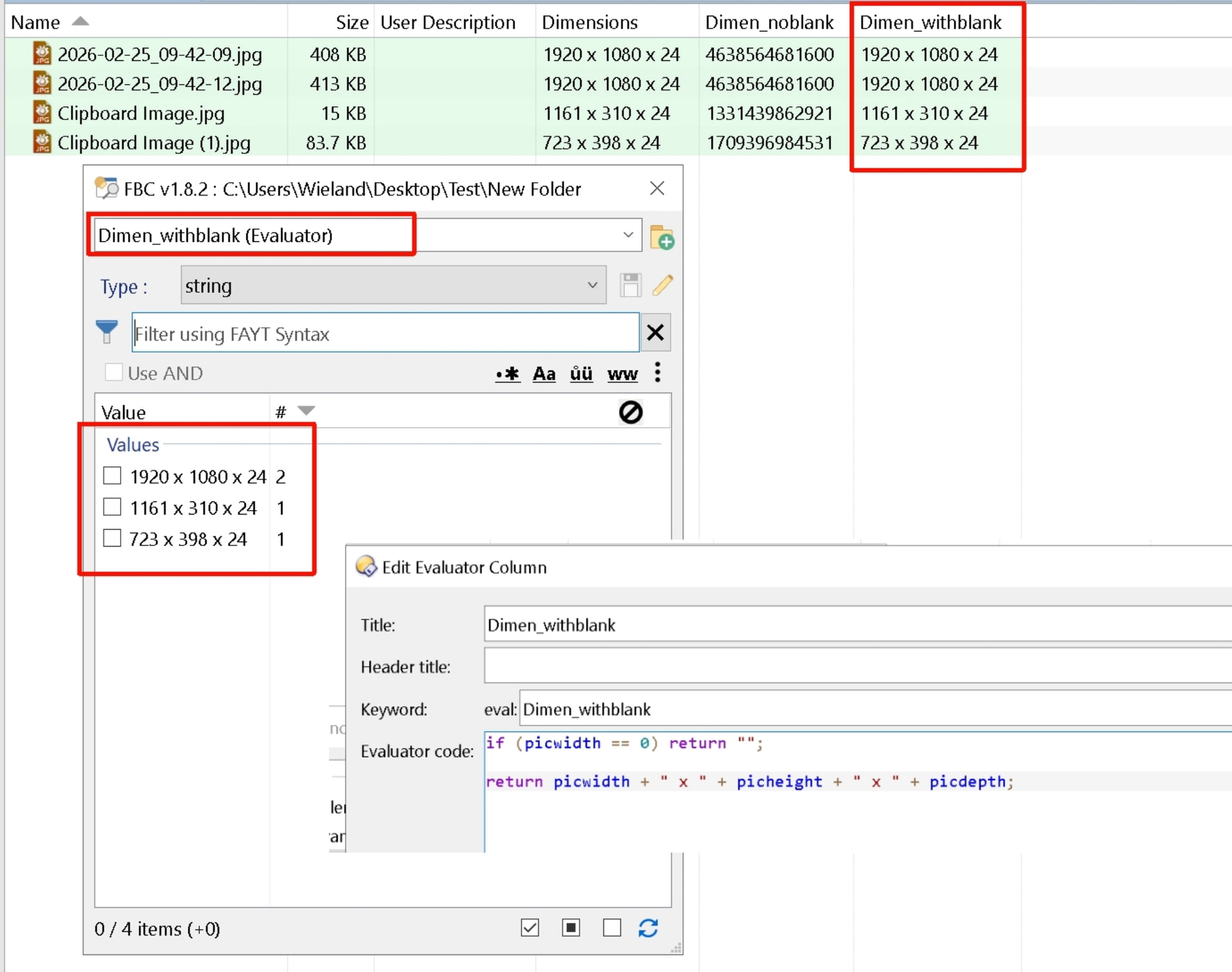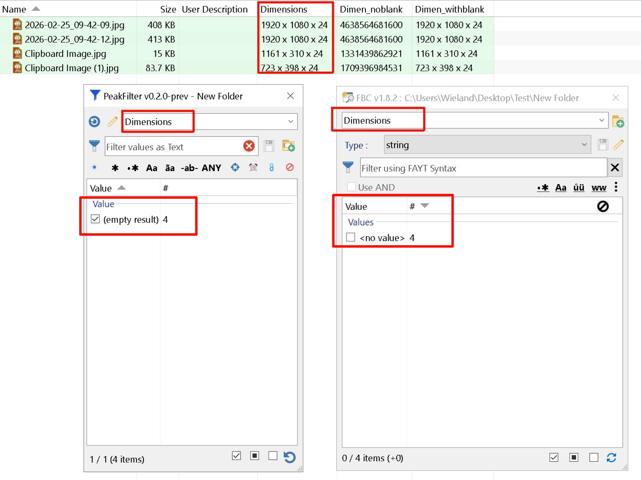 There are some images where the Dimensions column clearly has values (e.g., 1920 x 1080 x 24), However, when I try to filter this column using the script, it results in [empty results].