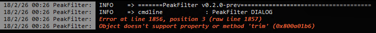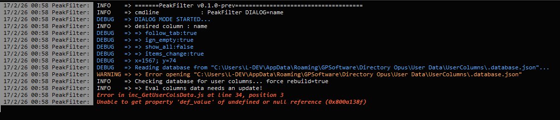 Thank you very much for the quick and attentive response. I tested the corrected version and once again encountered an error. The log is below. I am using a test VM with DOpus version 13.21.4 installed. Command used: "PeakFilter DIALOG"