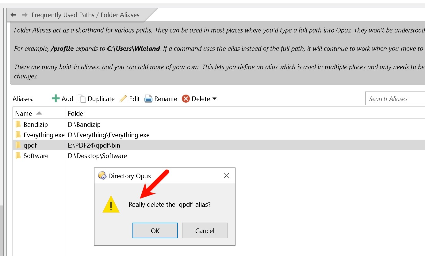 "Delete the ... alias?" or "Confirm deletion of..." or "Remove the settings for ..."