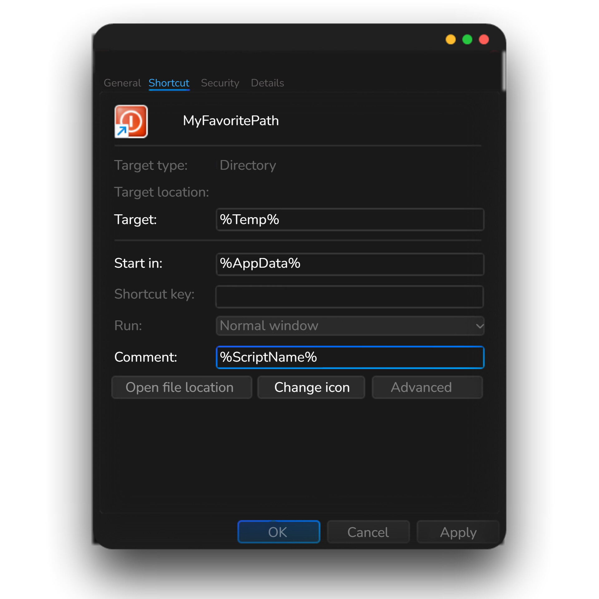 The "target" field is the main path you will see. You can change the displayed path and give it any name you want in the "comment" field. This field takes precedence over displaying the full or short path (Settings > Short path). All fields support environment variables.