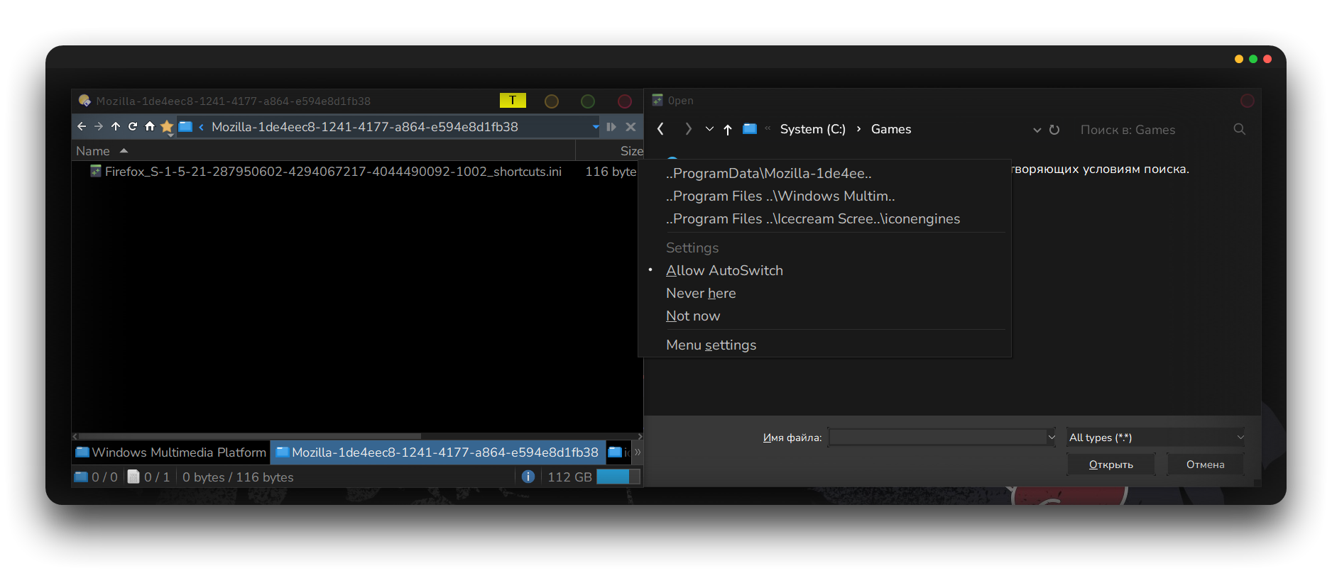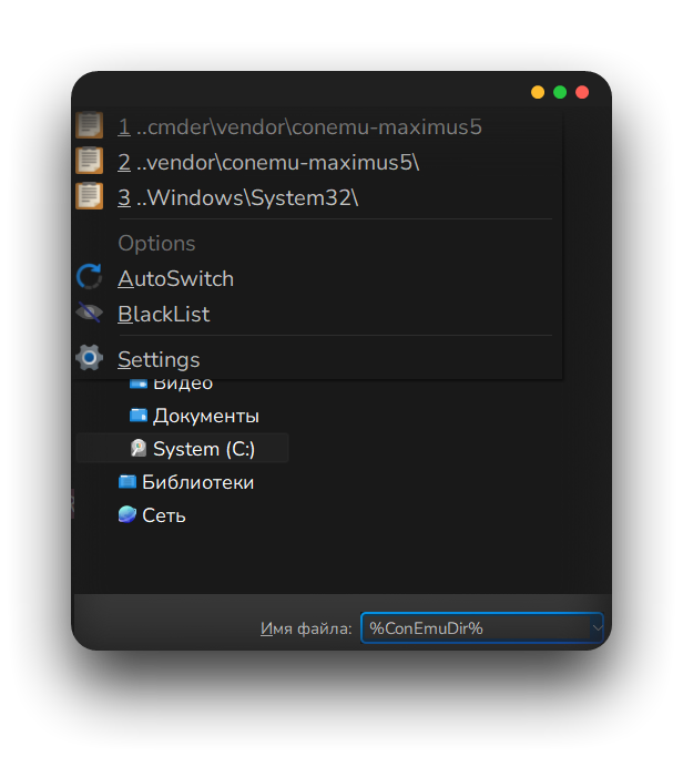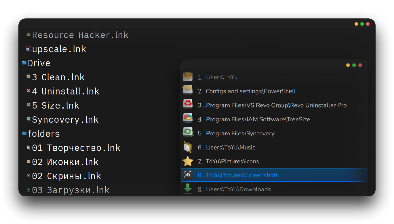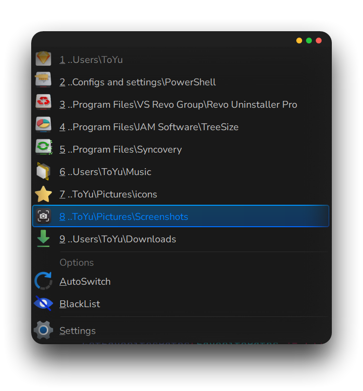 Enforce menu: press Ctrl+Shift+Win+0 and select the path to change the current path in the active file manager. This is useful if you want to duplicate paths between different file managers or their windows. If a non-file manager is open, the active window process will be started with the selected path as an argument. Let's reverse QuickSwitch!