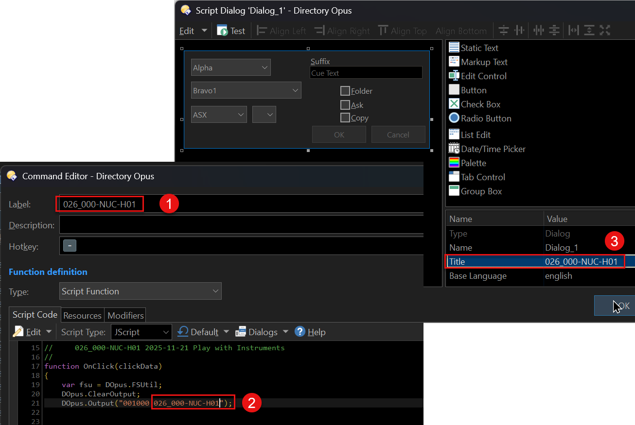 Does Opus resolve "regular" variables (with global scope) in a label maybe or by using an Evaluator? I did not check. That dialog title should be easy to update / set from within the script.