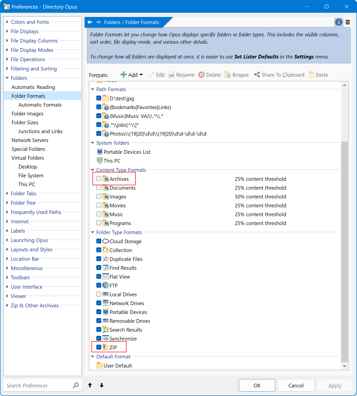 In Preferences / Folders / Folder Formats and in ... / Folder Images, the Folder Type "ZIP" is - like the Content Type "Archives" - not limited to .zip files.