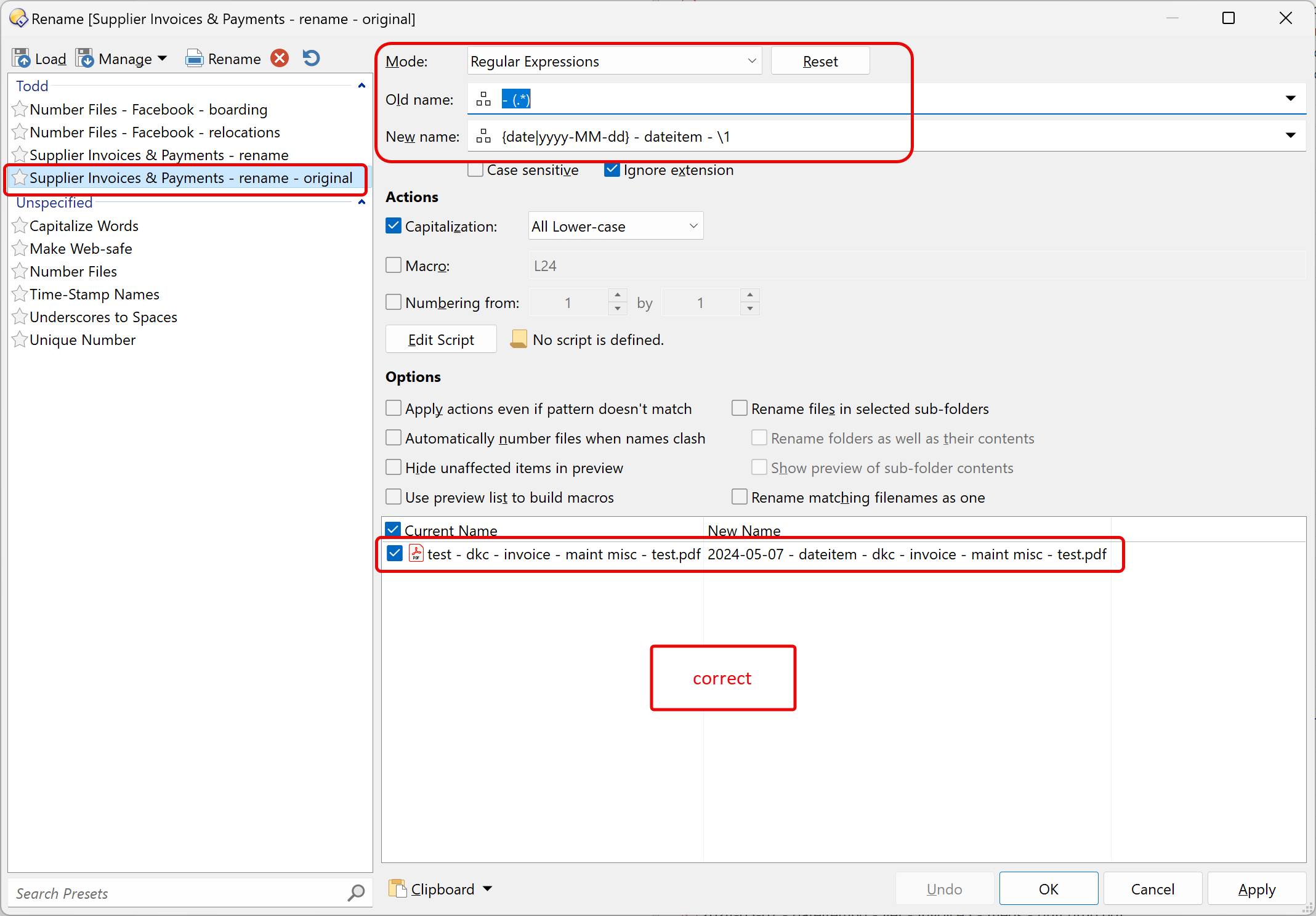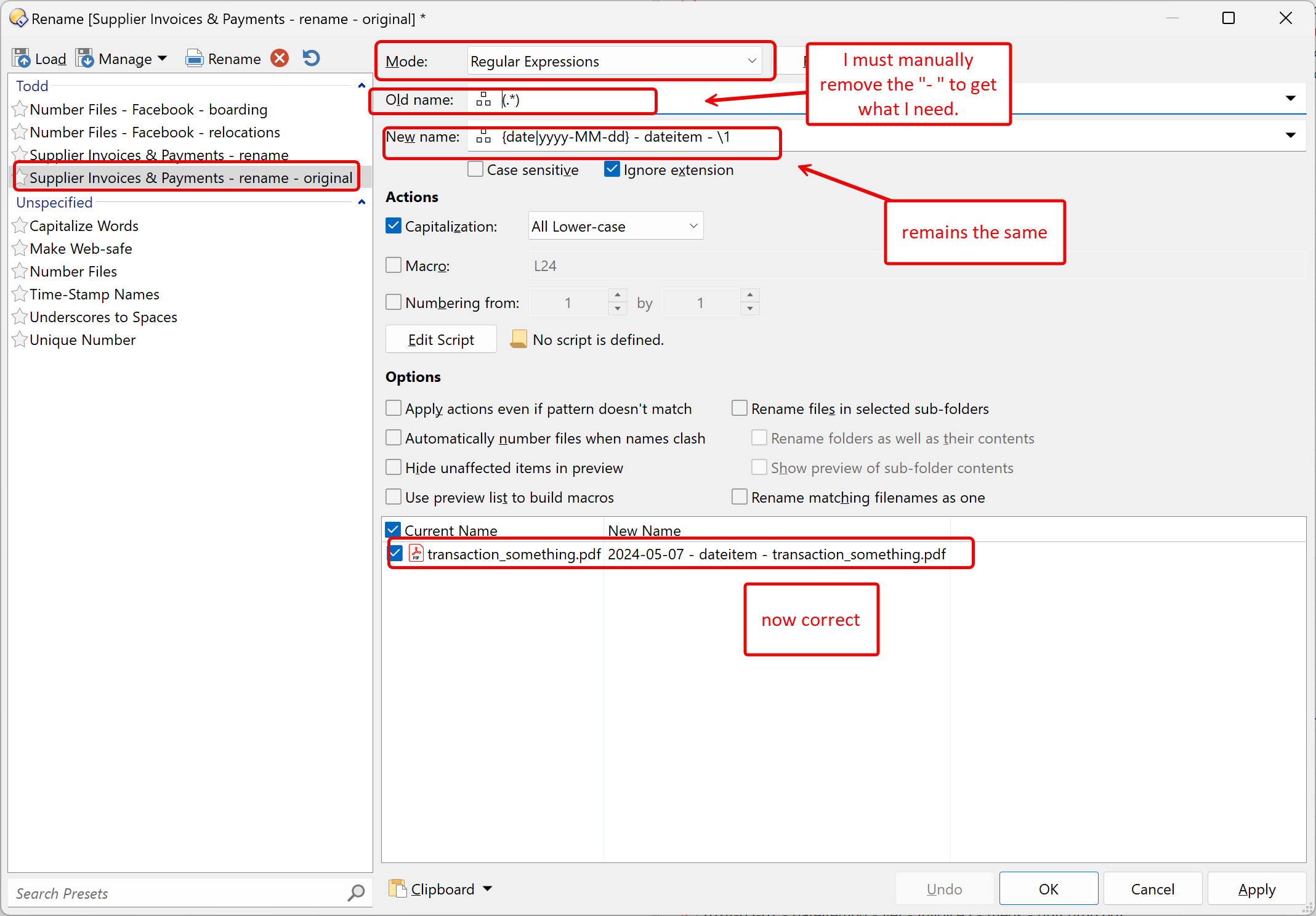 I'm using a custom saved rename preset for handling a standard filename rename I must do on a daily basis, many times a day.