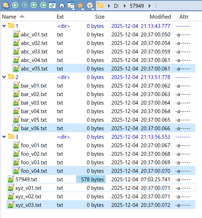 I was wondering how one would go about making a select filter or button that would select the highest version of a "file kind" such as in the example image below. I sometimes need to select the highest version of a folder name such as "MIKE_270_LT_v04" or the highest version name of a bunch of .jpg files in a flat list of files (only consistent thing in the filename is the "_v01' part.)